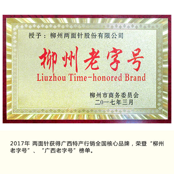 In 2017, it won the national core brand of Guangxi specialty marketing and was listed as "Time-honored brand in Liuzhou" and "Time-honored brand in Guangxi".